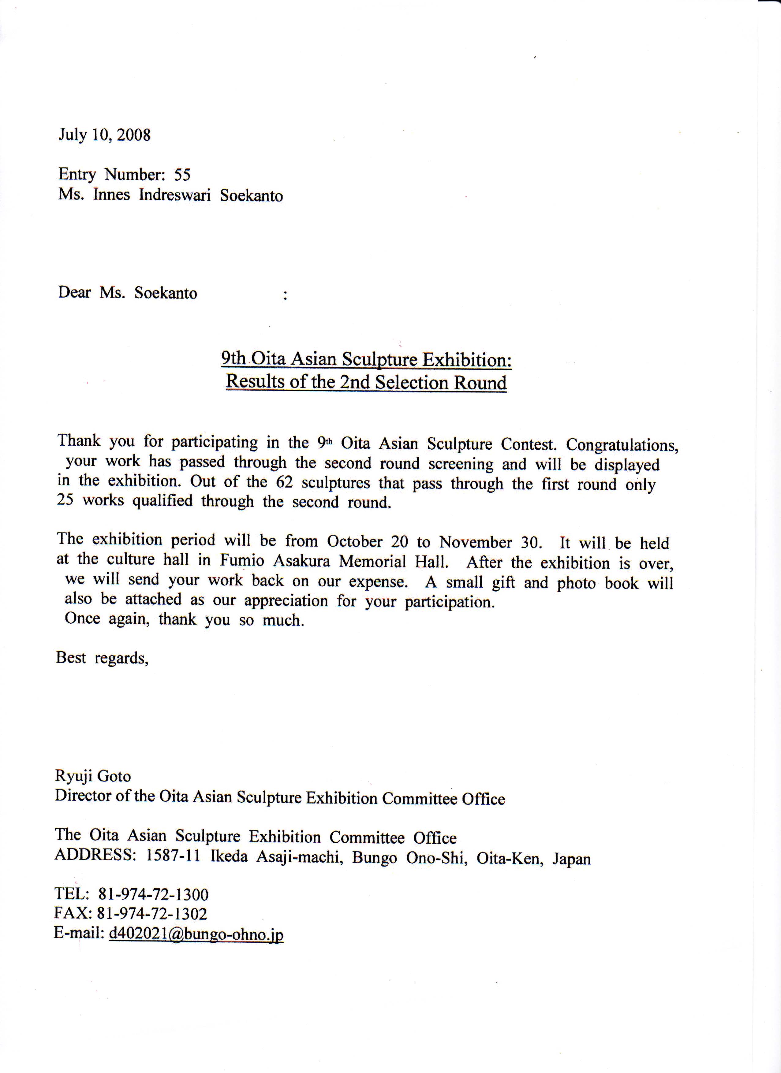 'My son = My sun', Oita 9th Asian Sculpture Competition, 2008 [letter of selection] |
